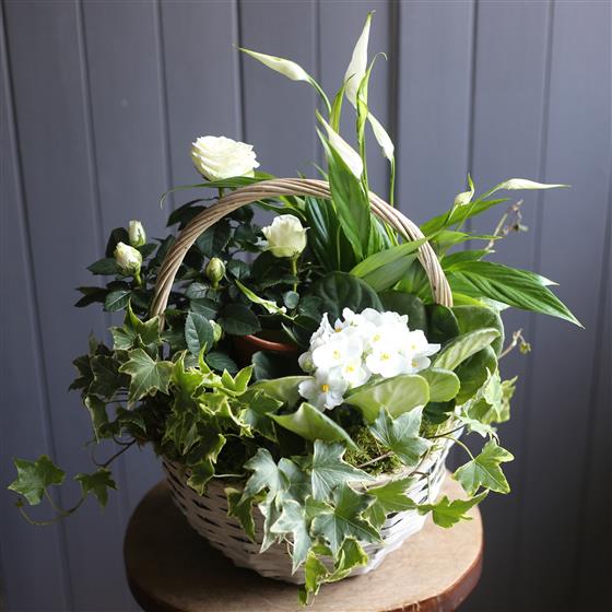 A basket filled with long lasting white flowering house plants.