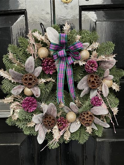 All hand made artificial Christmas wreath look as good as the real blue spruce with tartan ribbon.