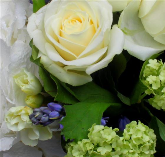 A graceful selection of whites and creams including roses and hydrangeas interspersed with purples and limes.