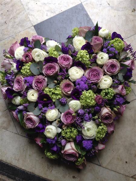 Loose purple, green and white solid heart of lullaby roses, white ranunculus, viburnum ,alyssum and eucalyptus .