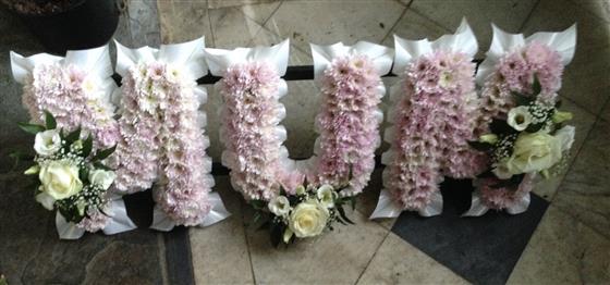 Massed pink mum tribute of pink chrysanthemum base, light pink ribbon surround and white roses display.