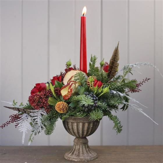 Stunning vintage styled urn full of festive flowers, seasonal foliage and tasteful decorations encompassing a single candle.