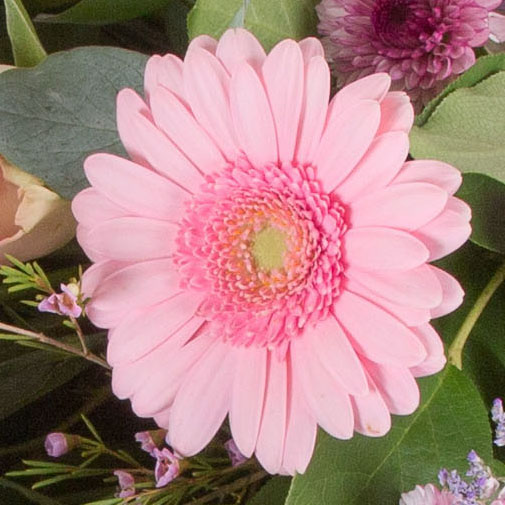 A pretty bouquet in lilacs and pinks including aconitum, carnations, gerberas, wax flower and complementing foliage.