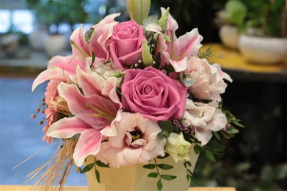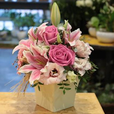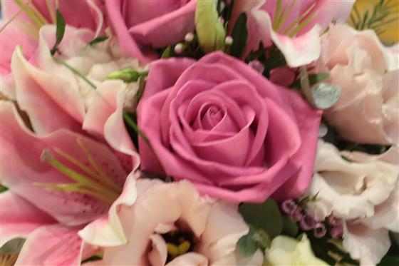 A scented arrangement of pink oriental lilies, roses, lisianthus, wax flower and mixed foliage.