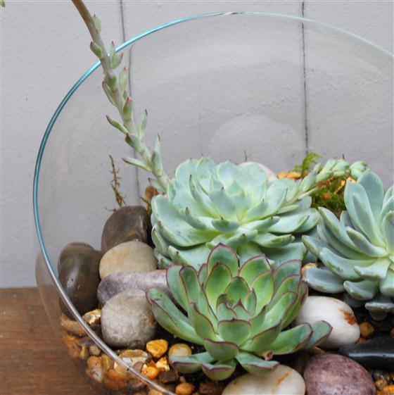 A mixture of hardy, low maintenance, long lasting succulents in a contemporary glass bowl. Bang on trend, this planted arrangement is ideal for an office or conservatory.